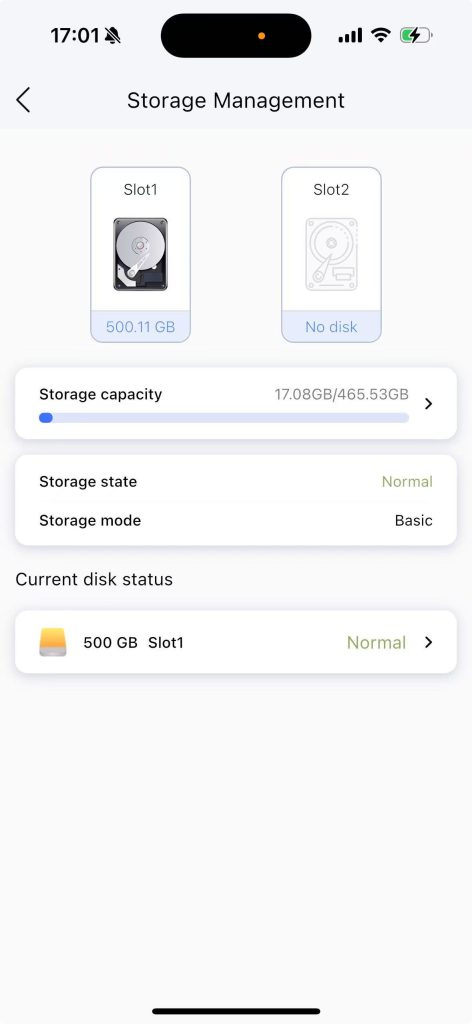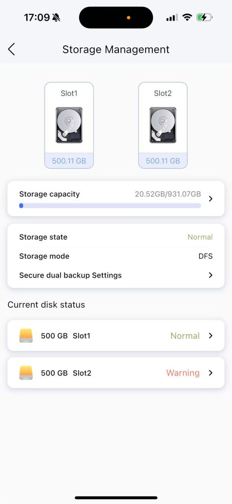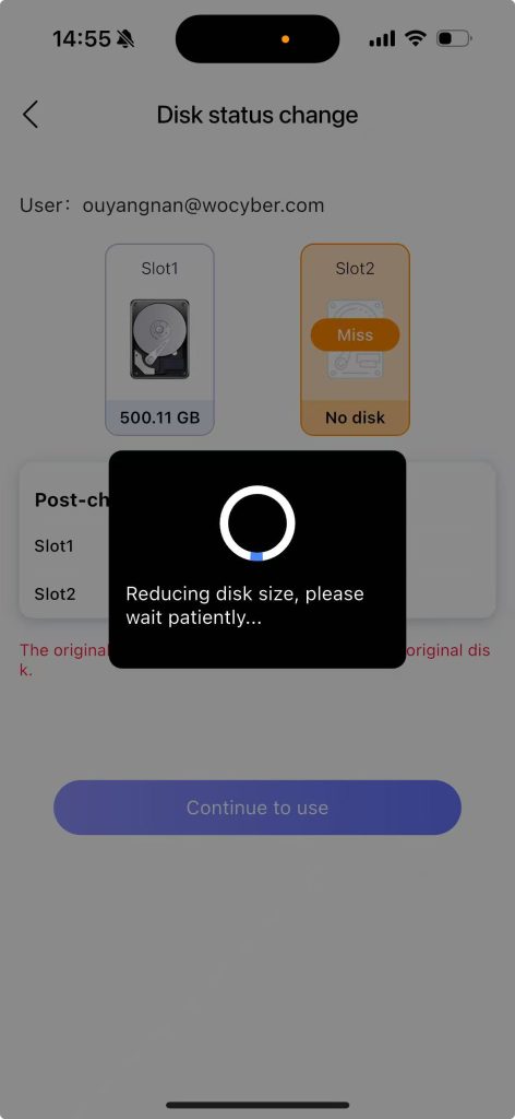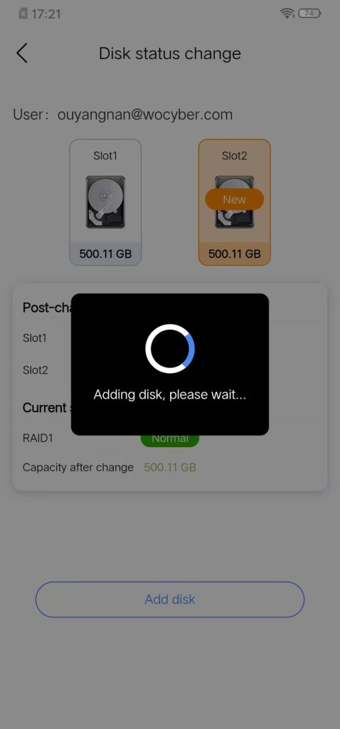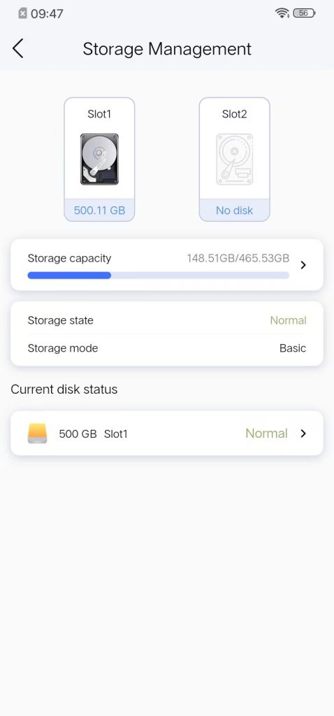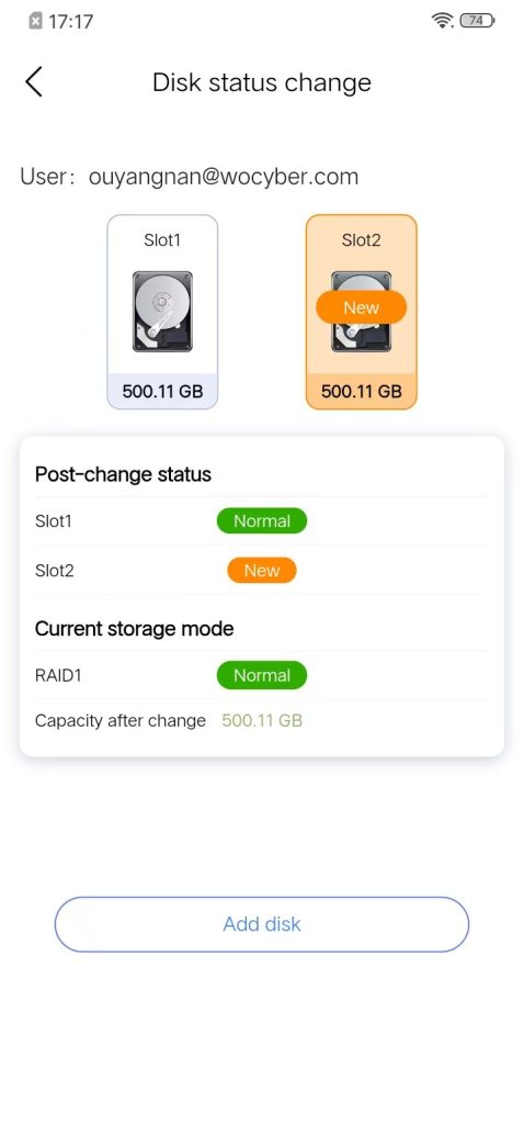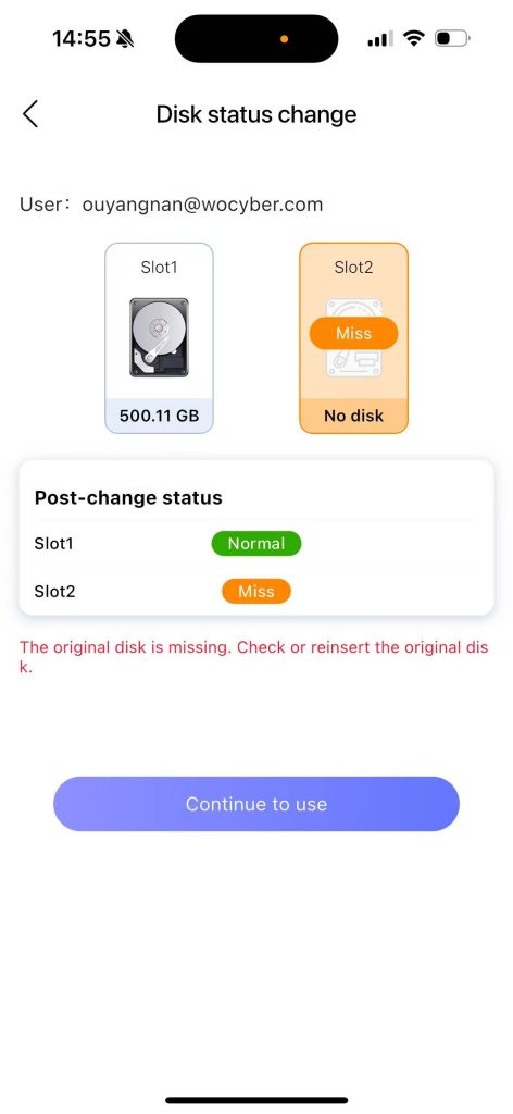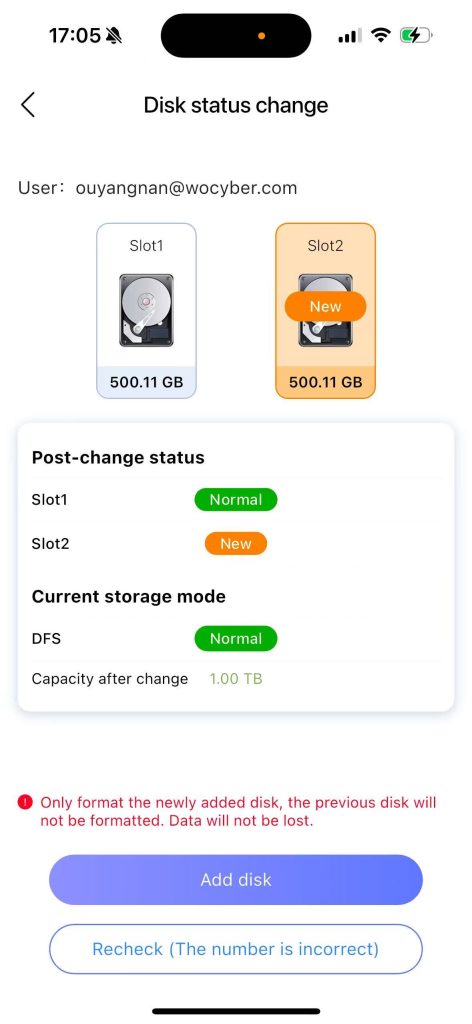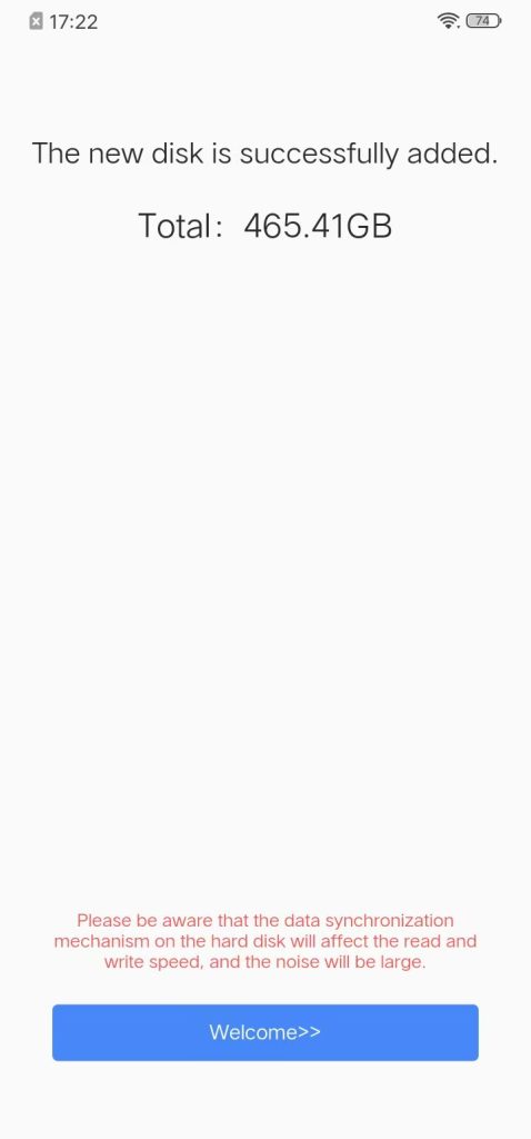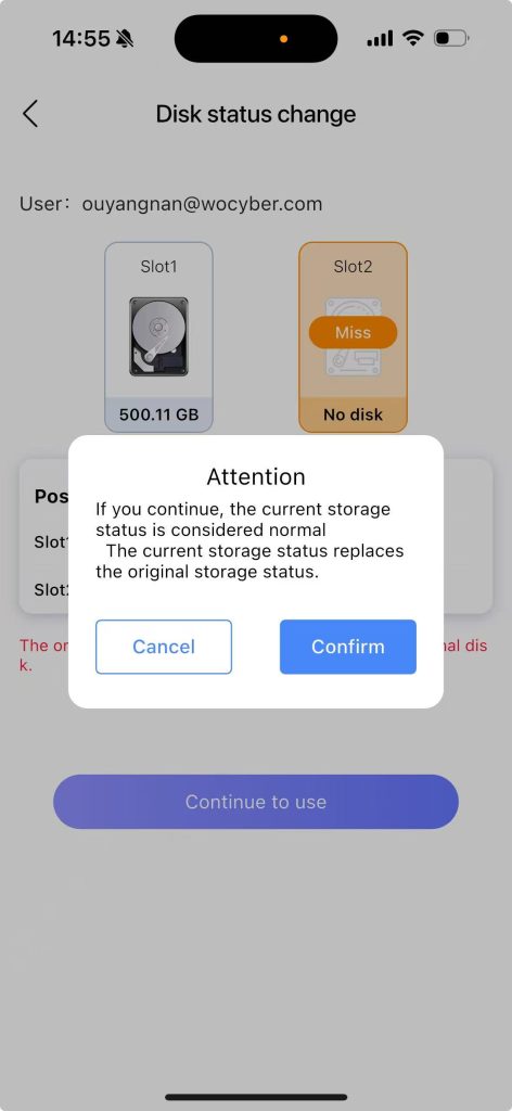 Step 1: Log in to the mobile app. A page indicating the change in hard disk status will pop up. At this time, the disk status light will flash slowly in red.
