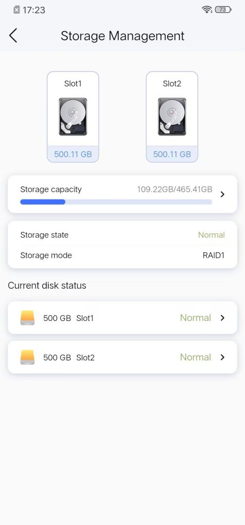 When logging into the APP, a page indicating the change in hard drive status will pop up, and the status light of disk 2 will flash slowly in red.