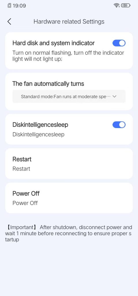 Step 1: Home page of the APP – Settings page – Click “Fans and Power Supply” to enter the hardware-related settings.