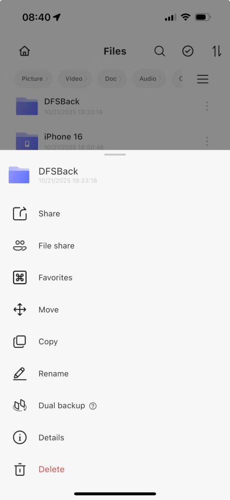 Step 1: Navigate to the APP home page, go to File Management, click the “…” button adjacent to the target folder, and select “Enable Dual Backup” from the dropdown menu.