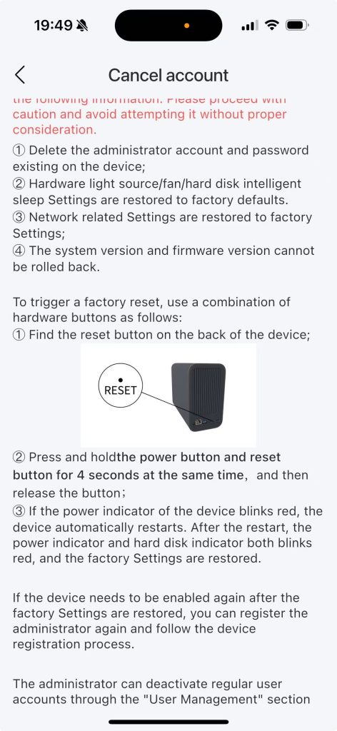 2. All data stored on the device under this account will be permanently erased and cannot be recovered.