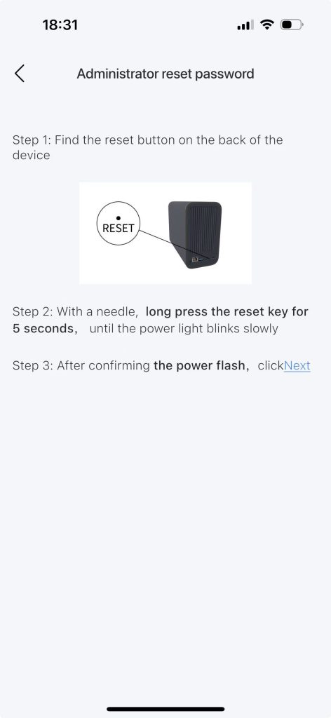 Step 3: Insert the needle-like object into the reset port at the back of the device and hold it for 5 seconds. The power light on the current panel will flash slowly in green.