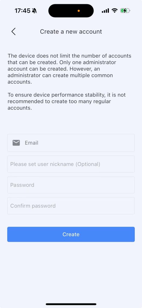 The first account registered on a device becomes the administrator account. Administrators have elevated hardware management privileges and are authorized to create, disable, and deactivate regular user accounts.